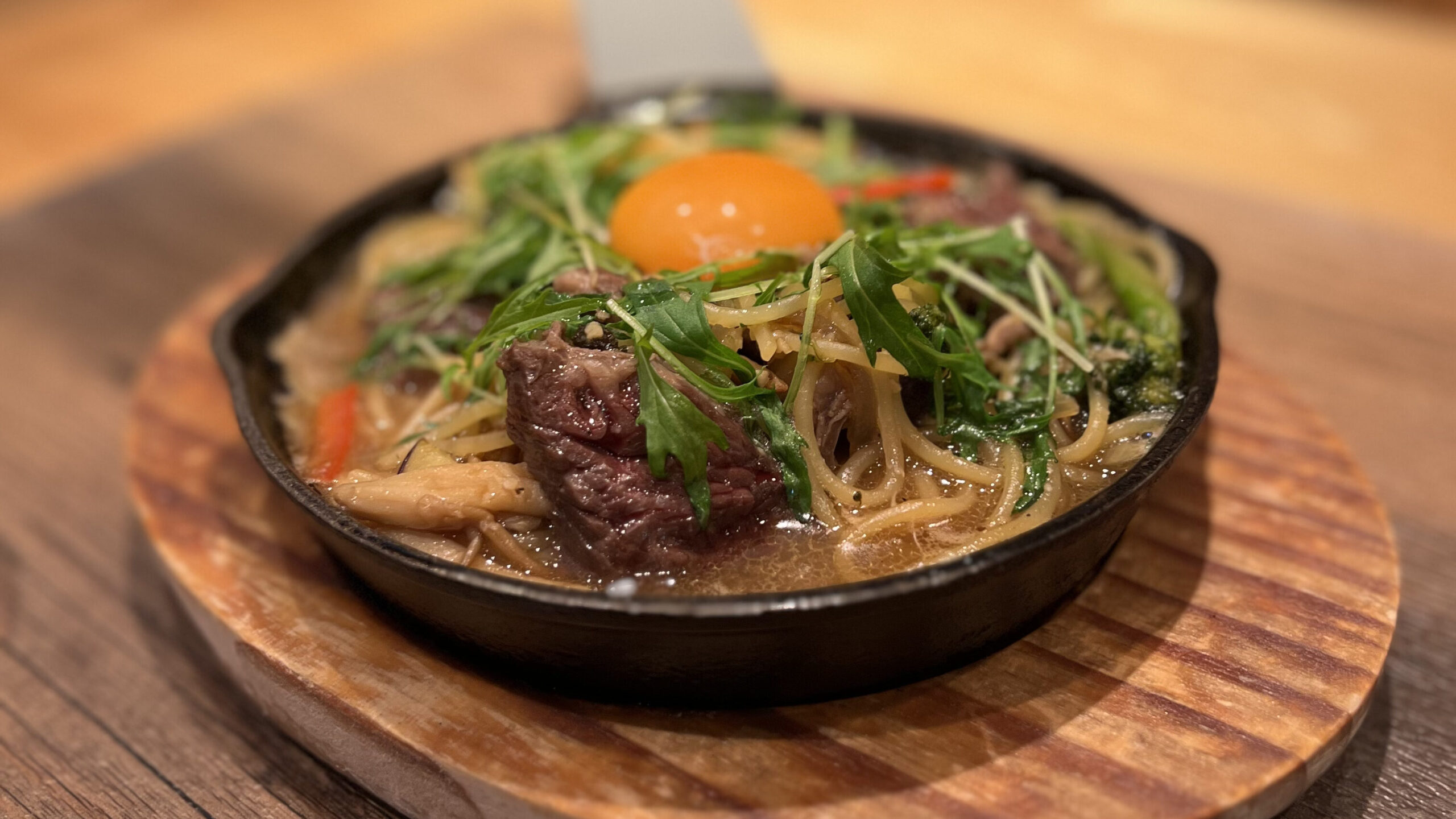 2月おすすめ 牛ハラミと彩野菜のすき焼き風パスタ 卵黄のせ